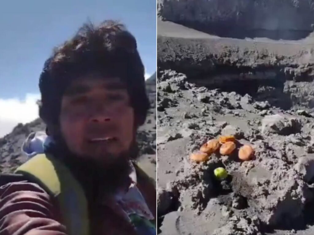“Le trajimos su ofrenda hasta acá, hasta el cráter. Esperemos que esté contento. ¡Se siente un gran miedo!”, expresa en el video.