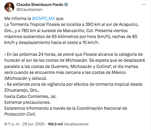 La presidenta de México, Claudia Sheinbaum, pidió a la población “extremar precauciones” ante el avance de “Flossie”, en un mensaje publicado en sus redes sociales.