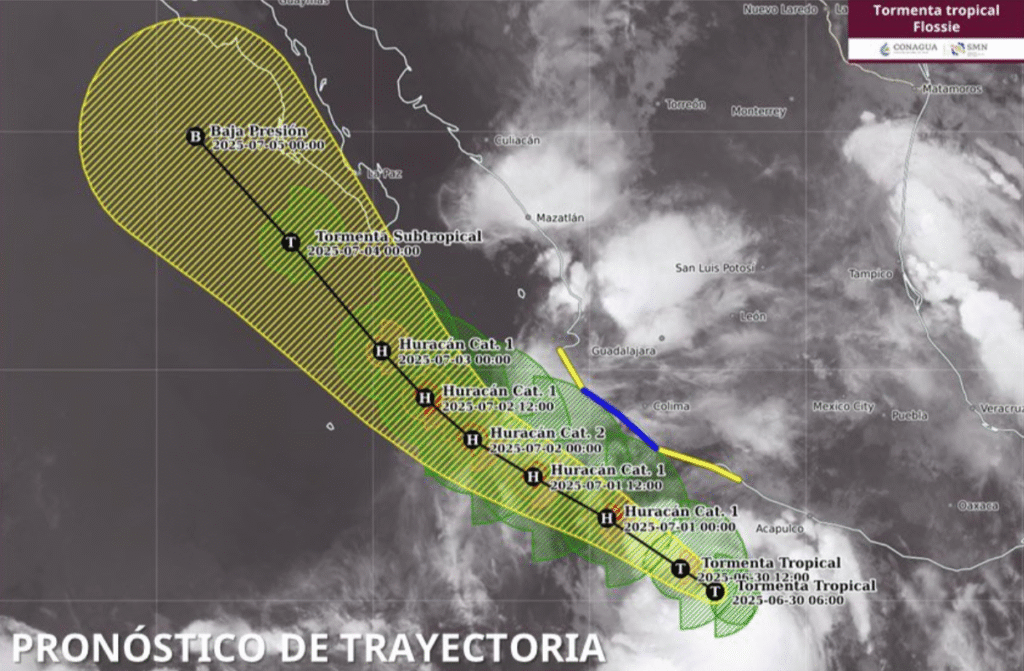 Se prevé que “Flossie” se fortalezca y alcance la categoría de huracán en las próximas 24 horas. Podría ser de categoría 2 para el miércoles 2 de julio, cuando se encuentre a unos 300 km al oeste-suroeste de Playa Perula, Jalisco, según el SMN.