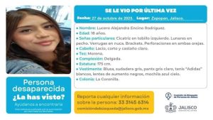 Lucero Alejandra Encino Rodríguez, de 18 años, desapareció el 27 de octubre de 2025 tras viajar de Guadalajara a la Ciudad de México para encontrarse con un hombre conocido como “Chris” por internet. Su familia solicita apoyo urgente para localizarla.