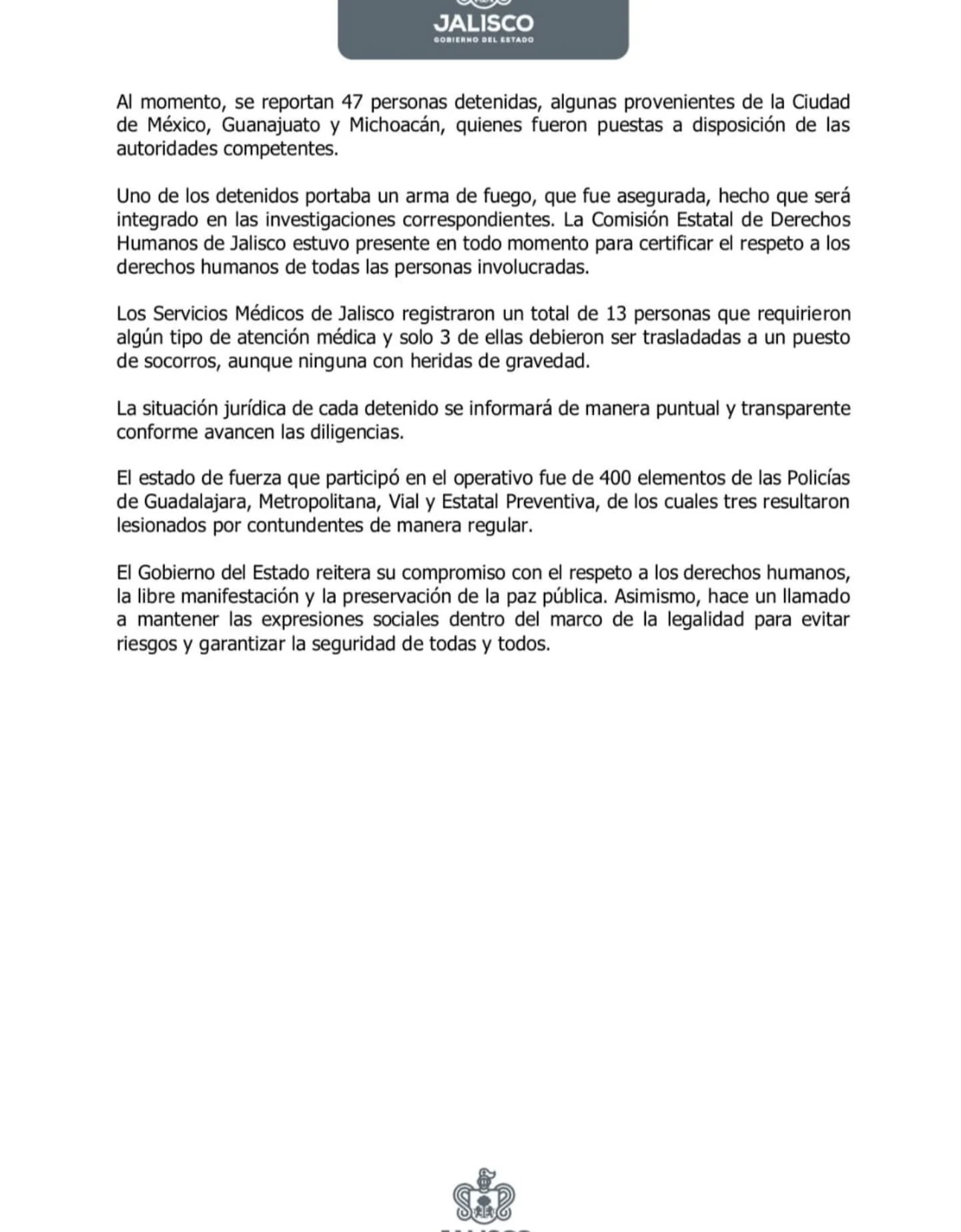 El Gobierno estatal aseguró que personal de la Comisión Estatal de Derechos Humanos Jalisco (CEDHJ) estuvo presente durante todo el operativo para garantizar el respeto a los derechos de las personas detenidas.