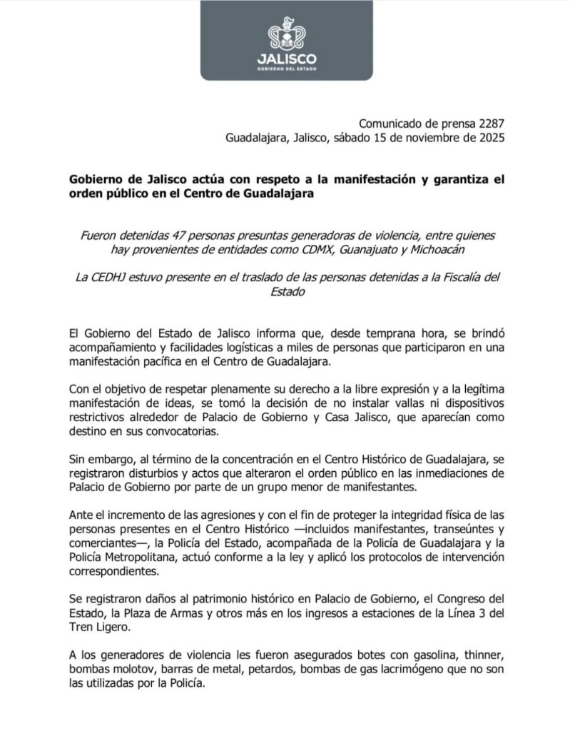 El Gobierno de Jalisco informó que la protesta posterior a la manifestación de la Generación Z en el centro de Guadalajara dejó un saldo de 47 personas detenidas, varias de ellas provenientes de la Ciudad de México, Guanajuato y Michoacán.