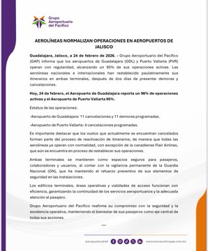 El Grupo Aeroportuario del Pacífico (GAP) informó que las operaciones en los aeropuertos de Jalisco se encuentran prácticamente restablecidas. El aeropuerto internacional de Guadalajara opera ya al 96% de su capacidad, mientras que el de Puerto Vallarta alcanza un 95%, con la mayoría de los vuelos programados en marcha.